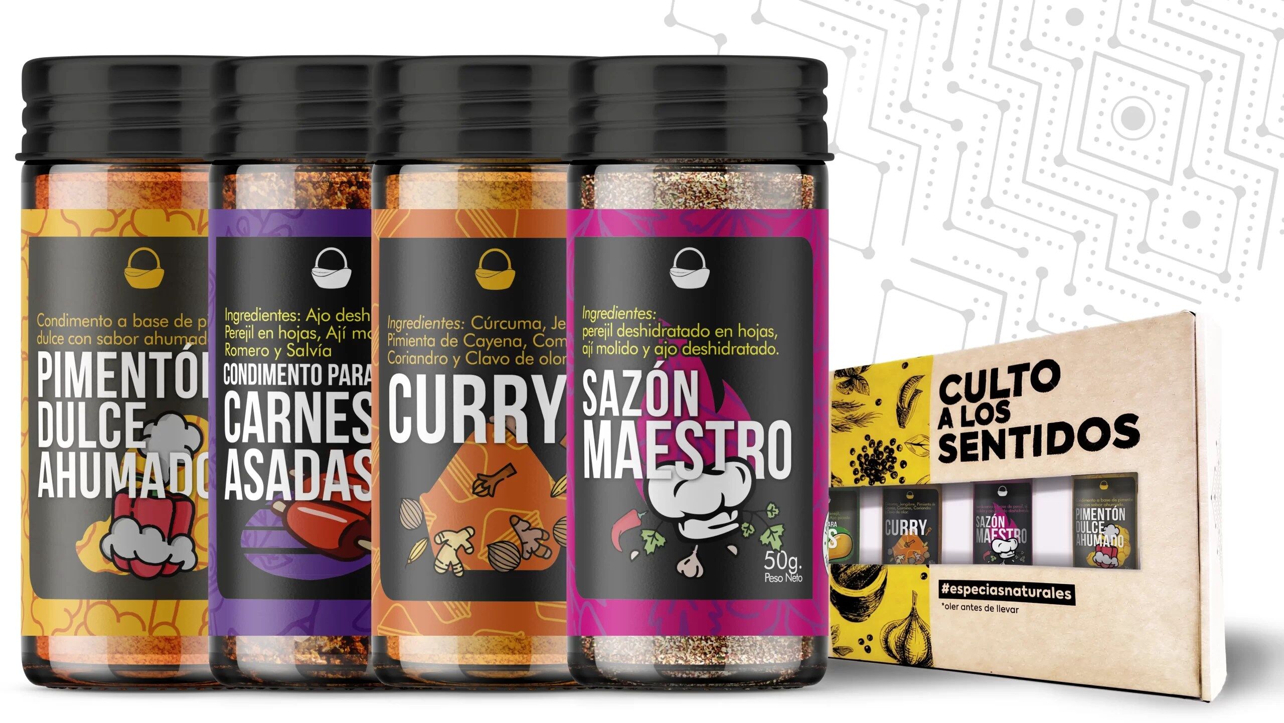 Set que contiene 4 de estos condimentos: Curry, Sazón Maestro, Condimento para Carnes Asadas y Pimentón Dulce Ahumado.